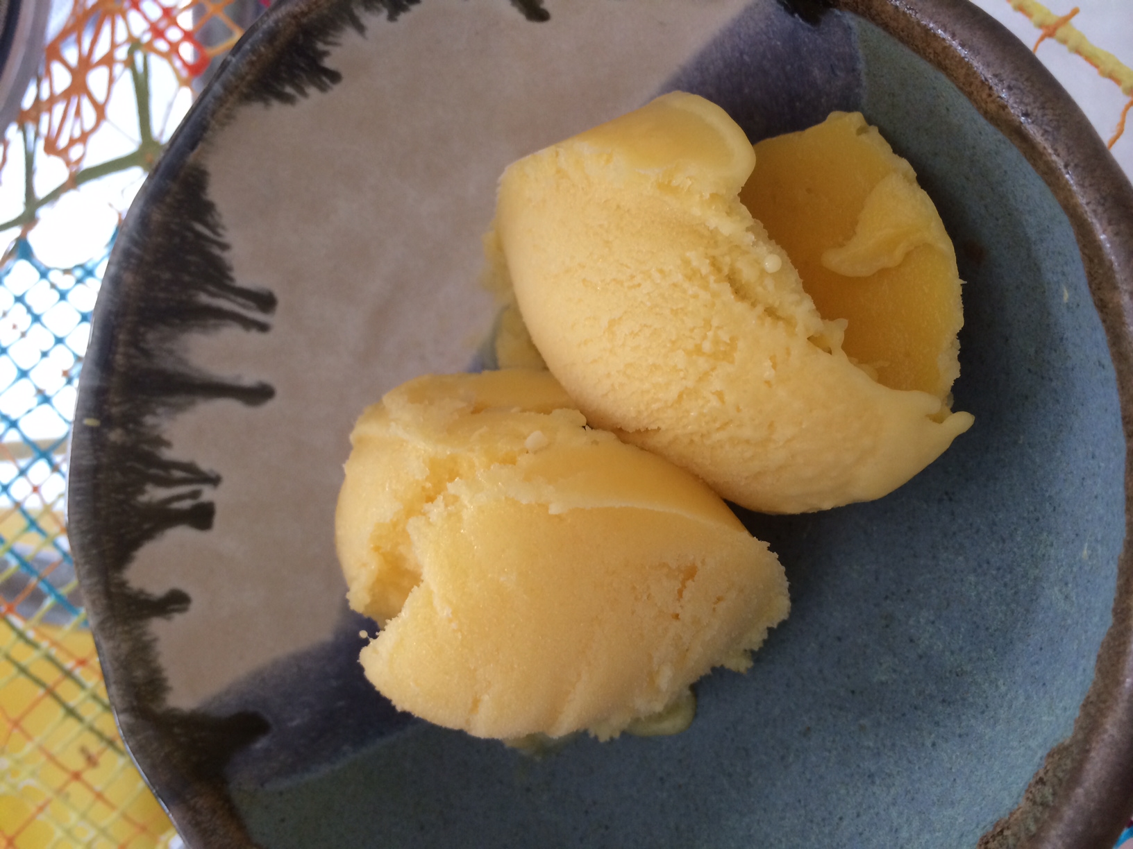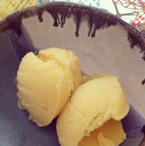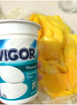No calor costumo trocar o meu sorvete favorito, o Tablito, pelo picolé de frutas, geralmente de limão. Pensando nisso, resolvi testar o sorvete de manga do Jamie Oliver, esse aqui. Ah, mas deve ser difícil, vou levar horas na cozinha e blábláblá. Que nada! Basta escolher uma fruta, picar 500g dela e congelar. Deixei de um dia para outro. Além da fruta, você vai precisar de mais três ingredientes: limão, mel e iogurte.