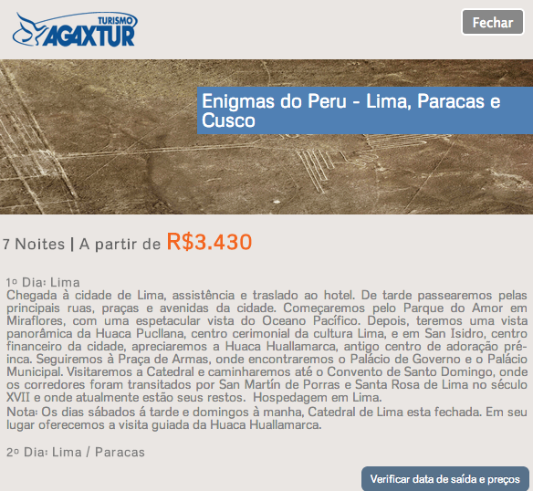 A foto é do deserto de Paracas, no Peru. Encantadora, né? Comecei a procurar nos sites das agências de viagem e cadê Paracas? Procurei em pelo menos três e nada, só tem Lima ou Cusco. Mas, na Agaxtur Viagens, quando você procura pela cidade ou país, eles mostram os pacotes possíveis, olha só: