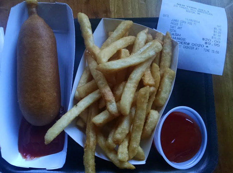 Entre tantas opções, escolhi o New York Deli e pedi o famoso Corn Dog com batata frita ($10). Como os atendentes eram brasileiros, ficou um pouco mais fácil entender o cardápio.