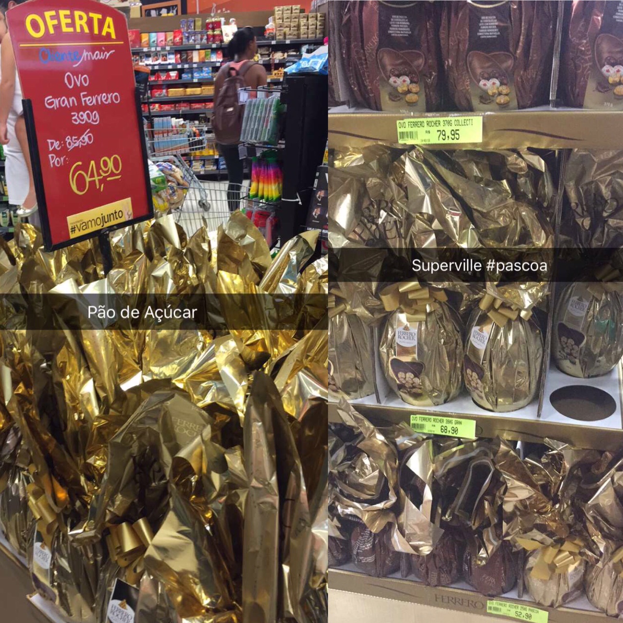 Comparando o Ferrero tradicional de 390 gramas em dois mercados, o mais barato é do Pão de Açúcar – R$ 64,90.