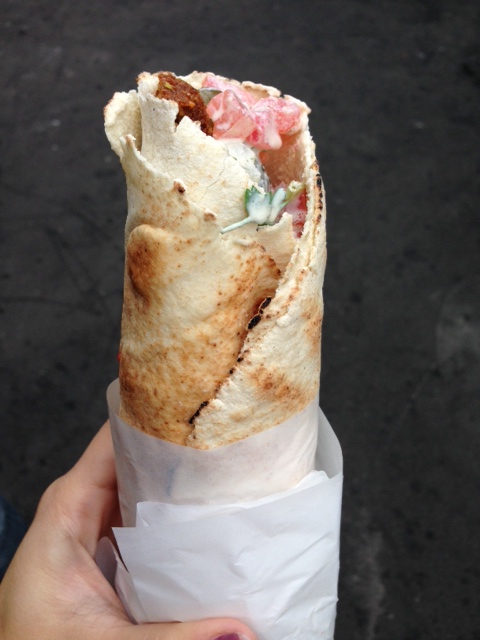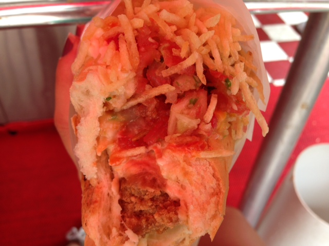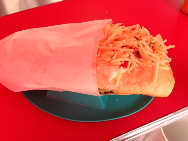 O ambiente é decorado com quadros de pin ups – que estão a venda – e é bem fofo, com cara de lanchonete americana, destas de filme antigo mesmo. Tem dois andares (mas só descobri o segundo andar quando saí de lá) no primeiro, você senta no balcão já quase na calçada, mas isso não é um problema, pois você fica praticamente em uma praça, que também é uma opção para comer. Já o segundo, apesar de pequeno, pelo que investiguei, tem mesas com bancos vermelhos super estilosos (desta vez fico devendo a foto).