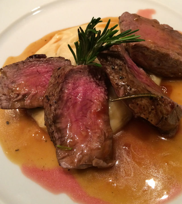 A sugestão do chef Manuel Coelho é servir com a mousseline de batata no centro do prato, o filé por cima e regar o molho.