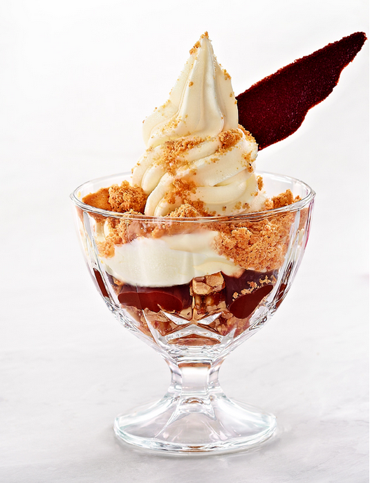 Frozen yogurt, doce de leite argentino, cerejas francesas ao kirsh, farofa crocante e café Ristretto Nespresso.