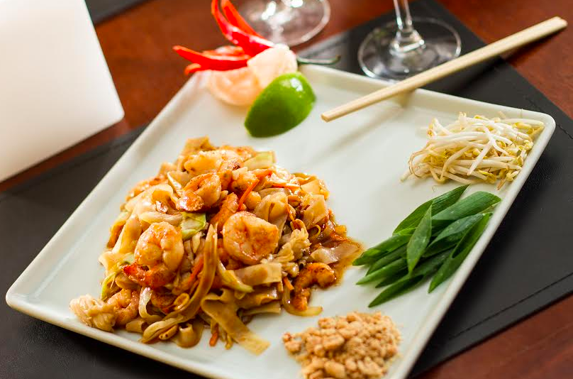 O prato principal fica por conta do Pad Thai, talharim de arroz com camarão, frango, legumes, castanhas e especiarias.