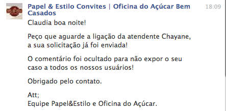 Na terça, à tarde, resolvi postar um comentário no Facebook. Apagaram. Escrevi de novo. Entraram em contato com a mensagem: