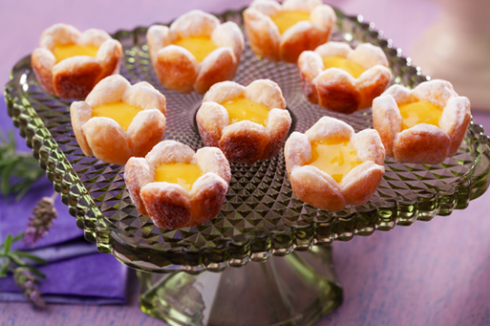 Coloque as flores em uma assadeira e, com uma peneira pequena, polvilhe o açúcar de confeiteiro UNIÃO GLAÇÚCAR. Com o auxílio de uma colher, recheie as flores com o creme de maracujá e sirva em seguida.