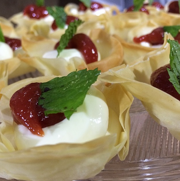 Abrir uma folha de massa filo e com um pincel passar a manteiga. Cobrir com outra folha de massa e novamente passar manteiga. Com um aro cortar a massa e colocar nas forminhas para assar em forno a 160ºC, até ficar crocante.
