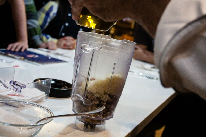 1. Bata no liquidificador as nozes, o parmesão e o azeite até a mistura ficar um creme homogêneo.