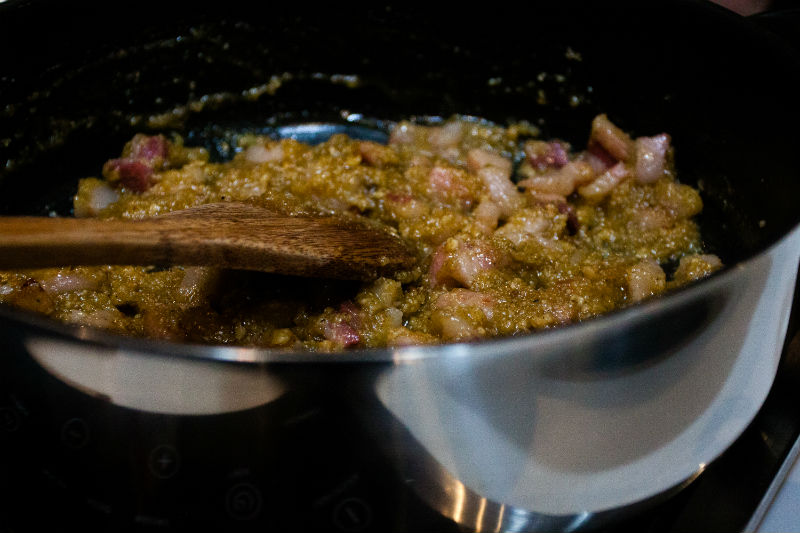 3. Em uma frigideira antiaderente doure a pancetta, acrescente o pesto e a massa. Mexa rapidamente até não sobrar líquido no fundo da frigideira e sirva imediatamente.