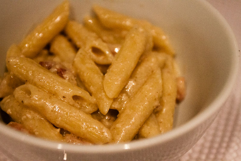 Corra para o mercado e compre: penne Barilla, nozes, parmesão (de preferência para você ralar na hora) e pancetta. Azeite e temperos eu espero que você tenha em casa.