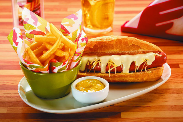 Por aqui, a clássica receita do pão com salsicha faz sucesso desde a década de 40, trazida pelos norte-americanos que para estas bandas vieram para ocupar as bases militares durante a Segunda Guerra Mundial. E, para comemorar o Dia do Hot Dog hoje, que tal provar o Time Square Dog, da rede America, que é servido com salsicha especial grelhada, coberta com molho cremoso de queijos, acompanhado de potinho de mostarda com ervas, no pão baguete. Acompanha onion rings ou batatas fritas (R$ 22,90).